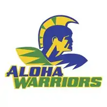 The community of Aloha (pronounced Ah-LO-wa) was likely named for a place in the state of Wisconsin, and not for the Hawaiian word aloha.[5] The association with Hawaii, however, gives the school its mascot, a Hawaiian warrior, and the design of the school crest, which includes a warrior and a conch shell, a symbol associated with Hawaii.[4] The crest was designed by students during the 1968–69 and 1969–1970 school years.[4]