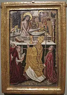 The Mass of Saint Gregory is a scene in Roman Catholic art which can be seen illustrated many times throughout the late Middle Ages. This version was painted in oil and gold (possibly tempura) by Spanish Archbishop Alfonso Carrillo de Acuña in 1480.[1] It currently resides in the San Francisco Legion of Honor.
