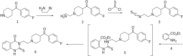 The reaction of 4-(4-fluorobenzoyl)piperidine [56346-57-7] (1) with 2-bromoethylamine [107-09-5] gives [1-(2-aminoethyl)piperidin-4-yl]-(4-fluorophenyl)methanone [83763-22-8] (2). The reaction of the terminal amino group with thiophosgene [463-71-8] leads to the corresponding isothiocyanate derivative, 4-fluorophenyl 1-(2-isothiocyanatoethyl)piperidin-4-yl ketone [84946-22-5] (3). Upon reaction of this reactive intermediate with ethyl anthranilate [87-25-2] (4), the transient addition product might be expected to be initially formed (5'). An intramolecular lactamization to the heterocyclic ring then occurs giving altanserin (6).