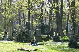 The Alter Nördlicher Friedhof, with its light planting of trees, today represents a significant green space in the Maxvorstadt district and is used as a small park, with due respect for those long since buried here. Many benches have been installed. On fine days the grass between the ivy-covered gravestones is popular for sun-bathing. The path round the inside of the wall and the arcades is much used by joggers: a single circuit round the four hectare space is about 750 metres.