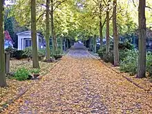 A Protestant parish named St. Matthäus (St. Matthew) was established in 1846 in southern Tiergarten area of Schöneberg. With the growing residents of eminent officials and scientists by the late 19th century, it became known as the "Privy Councilor's Quarters". The parish acquired a plot of land on the nearby hillside for their cemetery in 1854. It was first used for the purpose on 25 March 1856. It soon attracted even non-parishioners so that it had to be extended by 1883. To raise its value, interment fee for non-parishioners was increased in 1877. Due to impending saturation of the space, it was approved in 1890 that only the parishioners could use the cemetery. For non-parishioners, a new cemetery was created near the city. In 1909, a concrete funeral chapel was established in place of a small wooden chapel built in 1876. The artistic designs of the graveyard and chapel reflects the works of architects, sculptors, and artisans of the Prussian Empire. The German Reichstag planned to expand Berlin with demolition of the cemetery under Albert Speers' project. During 1938–1939, the northern section, covering one-third of the area, was demolished. The rest was to be done away by 1941. The government's investment in World War II led to loss of attention to the plan.[1] However, a number of graves were destroyed as Berlin was ravaged by the Allies towards the end of the war. The surrounding area, located between three rail lines, is known as "Red Island" as it served as a hotspot for anti-Nazi resistance.[8] The parish was dissolved in 2001, and the cemetery was taken over by the Evangelische Zwölf-Apostel-Kirchengemeinde (The Twelve Apostle Church) of Berlin. The City of Berlin had declared about 60 graves as heritage sites.[9]