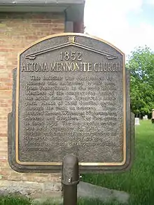 In 1852, the Altona Mennonite Meeting House (5475 Sideline 30, Pickering) was erected,[4] constructed by area Mennonite settlers. The bricks were made at the Cherrywood brick yard. Local families included the Barkeys, Reesors, Widemans, Nighswanders, Hoovers and Stouffers.[5] The first grave is dated 1835. The founder of Stouffville, Abraham Stouffer and his wife Elizabeth Reesor Stouffer, are buried here.[6]