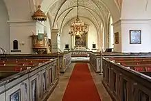 Among the furnishings, an altarpiece from 1862 was painted by the artist Johan Zacharias Blackstadius (1816-1898) with a framework carved by sculptor Fredrik Smedberg. The baptismal font is from the 15th century. The pulpit was carved in 1796 by Johan Westberg (1732-1811). [3]