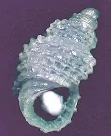 The spire is somewhat tapering. It contains 5 whorls, moderately convex, rapidly increasing in size, the last occupying half the spire. The apex is prominent but twisted. The suture is deep and angulated. The aperture is nearly round. The outer lip is thin and smooth inside. The inner lip is reflected on the columella, which is not umbilicated nor perforated. [2]