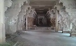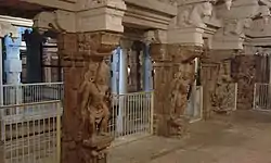 A granite wall surrounds the temple, enclosing all its shrines and two of its three bodies of water. The rajagopuram, the temple's gateway tower, is 95 ft (29 m) tall. Lord Vishnu is worshipped here as Aathinathan or Aathipiran. The Swamyabhu murti of Vishnu faces east and is in standing posture. The feet of the murti are buried under earth. Goddess Lakshmi and Bhudevi are worshipped here as Aathinathanayaki and Thirukkurukornayaki. The shrine is located on the banks of Thamiraparani River. The sacred water body in the temple is known as Brahma Theertham. In modern times, the temple is maintained and administered by the Hindu Religious and Endowment Board of the Government of Tamil Nadu.[11] The temples houses a number of paintings depicting various scenes of the epic Ramayana. There are composite pillars in the temple numbering 48 which has remarkable sculptures. There is a tamarind tree on the precincts of the temple, which is believed to have been the birth place of Nammalvar. Devotees take strips of the trees for medicinal purposes.[12]