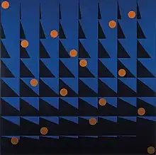 During the Jewish Women's Archive oral history interview Rothschild said that she her style gradually evolved from realist to abstract during the 1940s and early 1950s. She made the change entirely on her own in a slow self-taught process.[4] In viewing a retrospective exhibition of her work, a critic said in 2012 that Rothschild's 1948 oil painting "Portrait of Me (Self Portrait with Crossed Arms)" seemed to be a transitional work, particularly as it emphasized Rothschild's angular shoulders and arms.[16] This painting can be seen in the 1984 photo of Rothschild along with an earlier self-portrait. The photo is shown in the box at top. In the interview she also said her experience as a volunteer art therapist in the 1950s helped her to move away from planned and structured work and to move toward a more spontaneous expression of emotion. In 1958 a gallerist described the paintings in her emerging geometric style as "personal abstract statements characterized by subtlety of color, symbol, and pattern."[17] Her interest in the human figure persisted even as what was seen as her "distinctive take on geometric abstraction" evolved, and many of her paintings contain elements that derive from parts of the body as seen from unusual angles.[16][18] The 1968 acrylic painting "Ripening of the Oranges, Sicily" (shown at left) is said to be a first-rate example of how she relied upon a "gridded composition that allowed for both structural variation and representational allusion."[16]