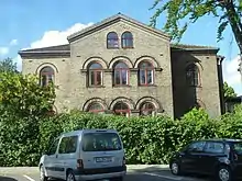 A half-timbered horse stable at No. 4 has survived. Billes Skole, a former school, is located at No. 20.