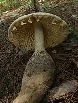 The stem is 10–25 cm (4–10 in) long and 1–3 cm (12–1 in) wide, and decreases slightly in thickness near the apex. It is solid (i.e., not hollow), white to pale yellow, and covered with tufts of soft woolly hairs or fibrils. It has a large basal bulb, swollen in the middle, which roots in the ground up to 5.5 cm (2 in). The partial veil is yellowish-white to pale yellow, forming a ring which is thick, woolly, delicate, and soon falls away. The universal veil remains at the stem base as thick scales, curved downward, often forming irregular rings.