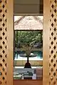 The hotel was designed by Ed Tuttle and is built in the form of a pillared temple from local coral-beige limestone (paras yogya) and 15 of the rooms have private pools.[1][2] The hotel has its own library (which often hosts lectures on the history of Java and its temples), art gallery,[3] Javanese spa and a swimming pool with Javanese green tiles, known as hijau danau, set into the rice fields.[1][4] The main pool measures 40 metres (130 foot) in length.[2] The hotel has 36 lavish suites, laid out in two crescents around the central rotunda. The suites (that measure between 243 and 1200 sqm) have limestone walls, domed roofs (some are thatched), high ceilings, terrazzo flooring, sliding glass doors, a central four-pillar bed, sungkai wood screens, coconut wood and rattan furniture, old batik pillows, and traditional glass paintings.[4] The seven Garden Pool Suites and seven Borobudur Pool Suites each overlook their own private pool. Bathrooms run the length of all suites and include twin terrazzo-finished vanities and outdoor sunken tubs set in walled gardens.[5] Many of the rooms have portraits of notable Indonesian people on them or traditional carvings. The rooms range from $850–$3,500 a night, excluding 21% tax.[6]