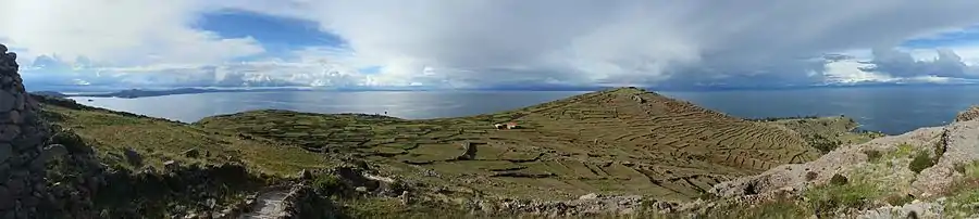 Amantani[1] is an island on the Peruvian side of Lake Titicaca. According to a 1988 census, it had a population of 3,663 Quechua speakers divided among about 800 families.[2] The most current census (2017) estimates a population of 3,557.[3] The island is circular and about 9.28 km2 (3.58 sq mi) in size. It has two mountain peaks, Pachatata ("father earth") and Pachamama ("mother earth"), with ancient Inca and Tiwanaku ruins on top of both. The hillsides are terraced, mostly worked by hand, and planted with wheat, quinoa, potatoes, and other vegetables. Livestock, including sheep, also graze the slopes.