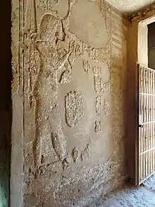The inner hall leads to the back of the tomb, where the shrine area is located. The uppermost segment of the lintel of the shrine's doorway is decorated with a carving of the uraeus.[5] The lower portion shows unfinished carvings of a line of djed-pillars.[10] The shrine houses an unfinished and disfigured limestone statue of Ahmose. In this statue-niche, the figure of Ahmose is seated, a characteristic pose of Egyptian burial sculpture which symbolises a willingness to receive offerings.[11] The empty recesses of the stone statue once consisted of coloured decorative elements carved out of faience.[10] A shallow libation bowl is carved in the floor at the foot of the statue, used for religious offerings to the gods.[5] The shrine area was closed off by wooden folding doors. The side wall of the statue-niche was cut in a perfect square, demonstrating expertise in stonemasonry.[5] Throughout the tomb, the undecorated walls are mostly covered in Greek graffiti, which was scratched into the plaster.