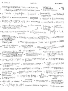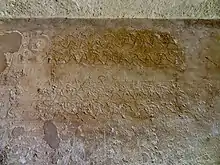 Fifty-nine instances of Greek graffiti have been scratched into the lower plaster of the tomb’s corridors.[8] The graffiti was discovered in 1835 by Sir John Gardiner Wilkinson.[3] Barry Kemp, the Director of Excavations at Amarna, has stated that this graffiti can be dated to the Ptolemaic Period.[20] The graffiti records the messages and names of the tomb's visitors, most of which are presumed to have been soldiers. A graffito in the corridor records a message from a Greek visitor; “I come. Year 37”.[3] The most well-known Greek graffito from the tomb is located next to the exterior door frame of the tomb. The inscription reads: “having ascended here, Catullinus has engraved this in the doorway, marvelling at the art of the holy quarriers”.[3] This graffito provides insight into later Greek perspectives on the art, technology and architecture of the Ancient Egyptians. Another message is a Coptic Christian graffito, providing evidence for the coptic occupation of the site.[21] Coptic Christians coopted the site of the North Tombs in the fifth and sixth centuries AD.[20] They inhabited the tomb of Ahmose, as evidenced by two low exterior walls which were built by later settlers.[22]