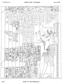 The inscription on the west wall of Amarna Tomb 3 is a prayer to the god Ra-Horakhty,[3] the combination of the gods Ra, the sun god, and Horus, the god of the sky and horizon. Like the “Hymn to the Setting Sun”, this inscription covers the creation of mankind and animals by the god Ra. This inscription is primarily concerned with the health and prosperity of Ahmose’s “beloved son, Nefer-kheperu-ra”.[3] Ahmose prays for his son’s wellbeing and success, calling on the god to “grant to him Sed festivals”, a celebration of Pharaonic rule and kingly power, “years of peace” and a “burial of his giving”.[3] Egyptologist Jan Assman stated that inscriptions of sun hymns in tombs became an established practice during the New Kingdom period.[19] He commented that the presentation of these hymns in burial contexts was a “fulfilment of a prescribed norm”,[19] not a reflection of individual religious piety. According to Assman, the sun hymns in the tomb of Ahmose are based upon a standard funerary text belonging to the cult of Aten.[19]