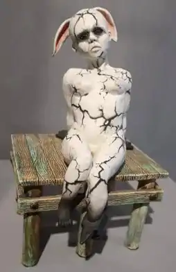 She is best known for creating human and anthropomorphic figures with a surface created by a technique of her own invention, which she calls "naked fauxku". By employing a high fire, oxygenated atmosphere without reduction, a surface similar to naked raku is produced.[4][5] Disabled, in the collection of the Honolulu Museum of Art, portrays a seated nude female figure with an anvil in place of her left foot. It was created shortly after the artist underwent surgery on her ankle. This porcelain sculpture demonstrates the surface typical of Aguirre's work as well as her sculpture's whimsy. The Benyamini Contemporary Ceramics Center (Tel Aviv, Israel), the Hawaii State Art Museum, the Honolulu Museum of Art, the International Ceramics Studio (Kecscemet, Hungary), and the Kellogg Art Gallery (Cal Poly University, Pomona, California) are among the public collections holding works by Amber Aguirre.[6]