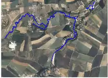 Amblie and its watercourses in satellite view: in the lower left the white point is the Amblie Orival quarry; the Seulles is on the left and the Thue a little more to the right
