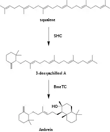 Ambrein is synthesized from common triterpenoid precursor squalene. The squalene-hopene cyclase (SHC) catalyzes cyclization of squalene into the monocyclic 3-deoxyachilleol A. Tetraprenyl-beta-curcumene synthase (BmeTC) converts 3-deoxyachilleol A into the tricyclic ambrein.[8]
