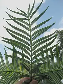 The leaves are spirally arranged on the shoots, but twisted at the base to lie in two flat ranks (except on erect leading shoots); they are linear-lanceolate, 4–12 cm long and 6–10 mm broad, soft in texture, with a blunt tip, green above, and with two conspicuous white stomatal bands below. They differ from the related genus Cephalotaxus in the broader leaves, and from Torreya by the blunt, not spine-tipped leaves.