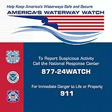 America's Waterway Watch (AWW) is a program of the United States Coast Guard and its Reserve and Auxiliary components to encourage members of the public to be on the alert for suspicious behavior by boaters.[1] As part of an effort to tighten security after the September 11 attacks of 2001, people involved in the maritime industry and recreational boating were encouraged by the Coast Guard to report suspicious activity to the National Response Center.[2] In 2005, Coast Guard Commandant Thomas H. Collins issued Commandant Instruction 16618.8, formalizing the program as America's Waterway Watch.[2]