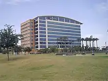 America West had its headquarters in Tempe, Arizona from the airline's start in 1983 and it retained the same location when it merged with US Airways and retained the US Airways name.[25] The airline used the nine-story[26] 225,000-square-foot (20,900 m2) building as its headquarters once America West and US Airways merged,[27] but the building has since been vacated when US Airways' management team took over American Airlines in an acquisition. Jahna Berry of the Arizona Business Gazette said in 2005 that the building "is one of the dominant buildings in downtown Tempe."[25] The City of Tempe gave America West $11 million in incentives and tax breaks so it could occupy the headquarters, which cost $37 million to construct.[28] The construction of the building began in January 1998; the groundbreaking ceremony was held on February 19 of that year.[29] The previous America West headquarters were demolished.[30]