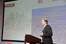 In the first six months of operation, the public affairs officer reported almost 44,000 visitors.[53] The project also maintains a social media presence including Twitter and Facebook.[53] Cameron R. Hume, the U.S. Ambassador to Indonesia at the time, was on hand for the opening.[54] Dino Patti Djalal described the space as "hip, modern and open – a place where young people want to hang out."[52] The use of communications technology, especially the U.S. provision overseas of connectivity to social media, has been described as reflective of a post-9/11 push to spur audience engagement in foreign lands in pursuit of U.S. public diplomacy objectives.[55] The success of @america is credited with the 2011 revamp of American Spaces with a focus on exhibiting American technology and culture, although @america has been criticized for posting high visit numbers without visible public diplomacy achievements.[56]