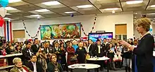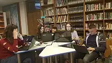 American Corners are areas within existing libraries or other institutions to provide information to the target populace located far from U.S. embassies.[68] At a start-up cost of US$35,000 the local U.S. embassy furnishes a space in a local library with several hundred books as well as six computers with internet access.[18] While the U.S. government provides the books and other materials, they are not staffed by Americans.[62] The concept proliferated across Eastern Europe and Central Asia in the early 21st century. In 2008, American Corners across Belarus (Babrujsk, Brest, Homel, Hrodna, Mahilyou, Malazhechna, Minsk, Pinsk, Polatsk and Vitsebsk) were closed without explanation.[69] As of February 2009, there were 414 such corners in existence.[18] A 2017 doctoral thesis posited a utilization analysis showing a cost-savings in American Corners, paired with a native institution and more-accessible to the general public than the spaces within heavily fortified embassies, indicating the former as more economical than the latter.[70] In 2002, then–Under Secretary of State for Public Diplomacy and Public Affairs Charlotte Beers proposed, in cooperation with the Smithsonian Institution, a program of "American Rooms" located within universities and other venues in the Middle East aimed at young adults to virtually display true American life as opposed to the fiction found on TV shows and movies.[71][72] In December 2016, one such room was opened at the University of Sarajevo providing students there an opportunity to observe U.S. public corruption trials.[73]