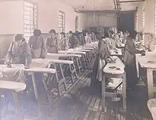 Inmates of the Indiana Industrial School for Girls ironing fabrics, circa 1907
