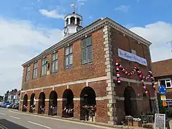The new building was designed in the neoclassical style, built in red brick with stone dressings and was completed in 1682.[1] It was arcaded on the ground floor so that markets could be held, with an assembly room on the first floor.[1] The design involved a symmetrical main frontage with six bays facing onto the south side of the High Street: this elevation featured a row of casement windows on the first floor with a coat of arms of the Drake family in the centre.[1] There were quoins at the corners, a modillioned cornice at roof level and an octagonal wooden cupola above.[1] An inscription stated that the bell in the cupola was manufactured by a Christopher Hudson.[4] A village lock-up for petty criminals was installed in the north-east corner of the building at an early stage, a water pump was erected in 1785 and a horse-drawn fire station was installed in the arcaded area in the late 19th century.[4] Trade guild meetings, school classes, magistrates' court hearings and political meetings were all held in the assembly room.[5]