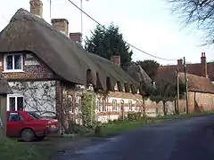 The Red House on Salisbury Road is a five-bay former farmhouse, rebuilt in red brick c.1700[47] and described by Pevsner as "the best older house ... with a pretty early-19th-century cast-iron porch".[46] This is the former home of Francis Stephen Long, Esquire, whose wife, Ann, remained at the Red House until her death in 1856.[48] Nearby on Salisbury Road, Antrobus House was built in 1924–5 under a bequest of Lady Florence Antrobus (1856–1923) as a memorial to her son Edmund, who died at war in Belgium in 1914.[49] Although intended as a village hall, Historic England state it is "built to a high standard". In handmade brick, the tall five-bay central block contains the hall and has substantial wings on both sides.[50] The low roadside wall in flint and stone has an overall length of 43m and a central iron gate set back from the road; the tall brick gate piers have stone vases.[51]