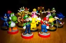 Amiibo[lower-alpha 1] (/əˈmiːboʊ/, ə-MEE-boh; stylized as amiibo; plural: Amiibo[1]) is a toys-to-life platform by Nintendo, which was launched in November 2014. It consists of a wireless communications and storage protocol for connecting figurines to the Wii U, Nintendo 3DS, and Nintendo Switch video game consoles. These figurines are similar in form and functionality to that of the Skylanders, Disney Infinity and Lego Dimensions series of toys-to-life platforms. The Amiibo platform was preannounced to potentially accommodate any form of toy, specifically including general plans for future card games.[2][3] Amiibo use near field communication (NFC) to interact with supported video game software, potentially allowing data to be transferred in and out of games and across multiple platforms.