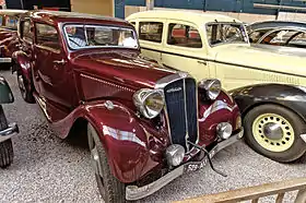 The front-wheel-drive Amilcar Compound was technically advanced in design for its era, featuring a monocoque frame made of a light alloy and independent suspension all around. Its engine at launch was a four-cylinder side-valve unit of 1185 cc.[3] The Compound's ambitious use of aluminium in its body structure, and its front-wheel-drive configuration, meant that production got off to a slow start, and although it was launched in October 1937, 584 of the 681 passenger cars produced date only from 1939, with a further 64 produced during the early months of 1940, before the German invasion of May/June 1940 effectively ended civilian automobile production in the Paris region.[4] Production prototypes for an upgraded Compound with an OHV 1340 cc engine were running by the summer of 1939, and this version was scheduled for an October launch at the 1939 Paris Motor Show, but the motor show was cancelled and the launch was postponed – as matters turned out indefinitely – due to the intervention of war which France (and Britain) declared against Germany in early September 1939.[4]