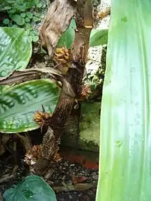 The name is derived from the Ancient Greek words αμισχος, meaning 'unstalked', and τολυπη, meaning 'tangle'.[1] The genus is characterised by its rather compact inflorescences which are composed on two or more cincinni that pierce through the base of the leaf sheath, and also by its seeds that are embedded in red arils. Flowers are actinomorphic, and anthers release their pollen either through a pore at the tip or slits down the sides. They are typically encountered in forest understories. The closely related genus Porandra, which consists of three Asian species, is considered by Robert Faden, a leading authority on the family, to be "doubtfully distinct" from Amischotolype.[3] Analysis of DNA sequences has shown that Amischotolype is most closely related to the genus Coleotrype, while these two are in turn most closely related to the genus Cyanotis plus its very close relative Belosynapsis. These four genera form a clade that is found only in the Old World, while all of its immediate ancestors are present only in the New World.[4][6]