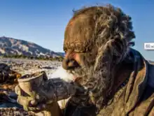 Amou Hajji was celibate, ate meat from dead animals he found (especially rotting porcupines), drank water from puddles and rusty oil cans, smoked animal dung using an old pipe, donned a war helmet to fend off the cold, and lived in a hole that he had dug himself.[3][7][8] To manage his hair, he burned off the excesses with a flame. His skin was covered with soot and pus as a result of his refusal to bathe.[9]