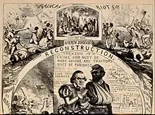 The ebb and flow of Andrew Johnson's historical reputation has often determined the critique of pieces like Amphitheatrum.[36] In particular, during the nadir of American race relations, "when Reconstruction racial and economic policies were viewed with particular disfavor, Johnson emerged the valiant hero who had bravely withstood the evil Radicals,"[18] and Nast was viewed as a useful idiot. For example, the author of A History of American Graphic Humor (1938) argued, "The widespread propaganda to the effect that Johnson was betraying the principles and program of Lincoln inflamed many much older men than the youthful Nast...All the fierce invective and scathing ridicule then at his command were launched at the unfortunate Johnson...Yet Nast quite deliberately and with honest conviction did his share in the vilification of the President. He showed him as a would-be king aiming at absolute power, as a drunken sot, and as a Roman tyrant."[2] Similarly, a 1957 analysis of Nast as crusader artist asserted that Amphitheatrum Johnsonianum was Nast's "most ambitious assault" on Johnson's Presidential Reconstruction but that Nast helped create false impressions of Johnson that "took two generations to correct."[48] Then, beginning in the 1960s, "Once black equality and the injustice of racial discrimination became the prevailing belief, Johnson's historical reputation had no place to go but down."[18] With Johnson's decline came a commensurate ascendance in the evaluation of Nast's Reconstruction-era art, which in 1965 was called "the best record we have of that era of American public life a century ago...Nast spoke to, and for, a vast number of Americans who were ready to believe that the good society lay close at hand...He had a strong sense of the United States as a nation of diverse peoples, welded together by self-government...Not until our own time could Nast's aspirations and his disappointments regain their original evocative power."[33]