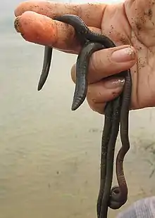 Unlike most other species of giant earthworm, which generally inhabit pastureland, the Mekong worm burrows into the muddy banks of the River Mekong in Laos.[2] The worm forms complex networks of tunnels and brings large quantities of ingested soil to the surface in the form of worm castings.[4] The worms may be collected from the mud, but are more easily collected from underwater at depths around 40 cm (16 in). Little is known of the worm's ecology.[1]