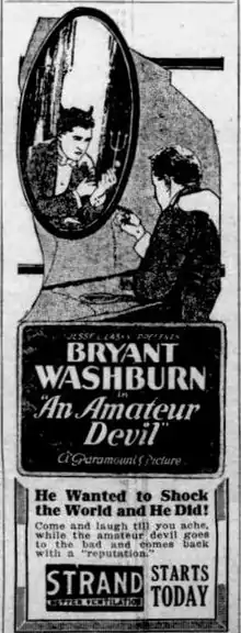 An Amateur Devil is a 1920 American silent comedy film directed by Maurice Campbell and written by Douglas Bronston based upon the short story "Wanted: A Blemish" by Henry J. Buxton and Jessie Henderson. The film stars Bryant Washburn, Charles Wingate, Ann May, Sidney Bracey, Graham Pettie, and Anna Dodge. The film was released on December 19, 1920, by Paramount Pictures.[1][2] It is not known whether the film currently survives.[3]