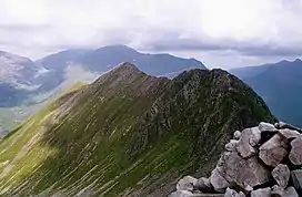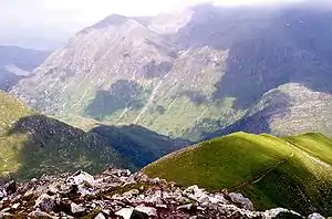 An Gearanach has a subsidiary peak, An Garbhanach ("rough ridge"), which lies 400 metres to the south: the two are connected by a narrow ridge which at one point is quite tricky as it tapers to a knife edge arête dropping into deep glens on either side and requires a good head for heights. There has always been some uncertainty about which is the highest point, with both An Gearanach and An Garbhanach given a height of 3,200 feet on pre metric maps in the 1970s.[8] An Garbhanach reaches a height of 975 metres and in 1921 was accidentally elevated to Munro status and An Gearanach reduced to a "top" due to the vagaries of old fashioned mapping techniques. The mistake was rectified in the 1933 revision of Munro's tables with an explanation that it had all been a mistake.[9] The northern slopes of An Gearanach require some care when descending from the mountain to Glen Nevis and there have been fatalities as walkers have left the stalkers path and tried to descend directly to Glen Nevis and got into difficulties on the crags above the An Steall Ban waterfall.[10]