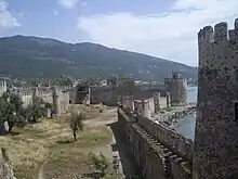 • Mamure Castle, the medieval castle, well-preserved, about 7 km (4 mi) south east of Anamur. Originally built by the Romans in the third or fourth century AD, it was enlarged by the Byzantine Empire and the Crusaders. After the Seljuk Turkish Sultan `Ala' ad-Din Kay-Qubad captured the castle in 1221, he had it rebuilt in its present form. It consists of three courtyards with 39 towers, surrounded by a moat. In one courtyard there is an ancient mosque with a minaret – built by Mahmud Bey of Karaman in 1300-1308 – which is still open for prayer. There are the ruins of a bathhouse on the opposite side. The castle is in two sections with two lines of ramparts between them, a walkway along the ramparts links the two sides.
