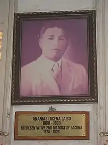Ananias Lucena Laico was born on January 24, 1877, in Magdalena, Laguna, Philippines, the fourth child of Don Luis Ong-Layco by his second wife, Doña Maria Concepcion Bernardo Lucena. According to tradition, the Laico family originated from Xiamen (formerly known as Amoy), Fujian Province, China, although the Ong-Layco surname or variants have appeared in Laguna parish records since at least the late eighteenth century.[1] Ananias' father was from Pagsanjan, Laguna, while his mother was from Magdalena.