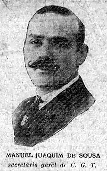 Under the influence of revolutionary unionism, workers' structures developed very rapidly from 1909.[1] The General Confederation of Labour was founded on 18 September 1919 in Coimbra,[5] on libertarian bases.[1] Manuel Joaquim de Sousa was elected general secretary.[6] The fundamental principles and objectives of the CGT, adopted at this congress are: the free autonomous federation of workers; direct action – outside any political or religious influence – with a view to eliminating the wage system; the collectivization of the means of production; the internationalism of workers' solidarity and the elimination of capitalism. The confederation created a newspaper A Batalha (The battle) which defended revolutionary unionist positions.[7]
