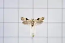 The wingspan is 11–14 mm. There is a triangular black blotch occupying nearly the whole median third of the costa on the forewings, reaching three-fourths across the wing. There are several variable small spots of blackish irroration (sprinkles) around the posterior part of the costa and termen. The hindwings are grey, thinly scaled and semihyaline (partially glass like) towards the base and darker towards the apex.[2]