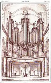 The grand-organ, with sixty stops and four manual keyboards, two of which are five octaves long, built in 1732 for the abbey by Cornil Cacheux and completed by Charles Dallery, with its buffet adorned with statues of David and Sainte Cécile carved in 1760 by Antoine Gili (1702–1781) [10] after drawings of the monks, was transferred in 1792 to the Collégiale Saint-Pierre de Douai by Louis Péronard.[11]