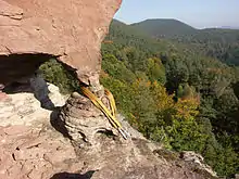 In rock climbing, an anchor can be any device or method for attaching a climber, a rope, or a load above or onto a climbing surface—typically rock, ice, steep dirt, or a building—either permanently or temporarily. The intention of an anchor is case-specific but is usually for fall protection, primarily fall arrest and fall restraint. Climbing anchors are also used for hoisting, holding static loads, or redirecting (also called deviating) a rope.[1]