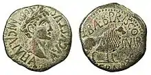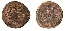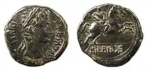 The history of ancient Iberian coinage begins as early as the fifth century BC, but widespread minting and circulation in the Iberian peninsula did not begin until late in the third century, during the Second Punic War.[1] Civic coinages - emissions made by individual cities at their own volition - continued under the first two and a half centuries of Roman control until ending in the mid-first century AD.[2] Some non-civic coins were minted on behalf of Roman emperors during this period and continued to be minted after the cessation of the civic coinages.[3] After the cessation of the civic coinages, these Imperial coins were the only coins minted in Iberia until the coins of the Suebi and Visigoths.