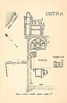 ![]() Map of Ancient Ostra, drawn up during the excavations of 1903-1904 made by Cav. Baldoni. | |