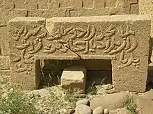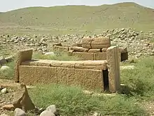 Two Burial places of the ancient graves in Wahi Pandhi are sited along both banks of Narri or Nalli hilly torrent are locally called roman’s graves. Both necropolises can be counted of different periods.[1] The awning of Smail Fakir is the sole monument of the desert of Kachho which is constructed with heavy carved pillars without any material. The Ceiling stones of the canopy are expertly engraved with gorgeous Sun-like structure.[1] The graves are built with yellowish stone blocks. It seems no any material was used for fitting stone slabs together with. Many memorial names and other inscriptions are inscribed on stones to be belied in Kufi or Persian language script.[1] It is believed that these belong to the invading period of Alexander the Great and some scholars are of the opinion that these ancient graves belong to Baloch tribe but question arises that which Baloch tribe had tradition to keep corpse in open or columned graves with carved stone slabs. Bherumal Maharchan Adwani considers the graves of Zoroastrians. In Sindh, invasion of Persia Iran can be traced from Daruish-1.[2][1] In 637 AD, during the battle of Qadisia,[3] the Muslims invaded Persia. The Zoroastrians were called Gabrs in the reflection Gabr, the Zoroastrians called themselves Behdin or Bahadin. Many Gabr or Gabar as well Givar Bands are constructed near hilly torrents for collecting waters in Kirthar Mountains Range which indicate to Zoroastrians.[1] Zoroastrians or Parsis still live in Pakistan[4] and India.[2] History reveals that Zoroastrians or Parsis migrated from Iran to Punjab, Pakistan and Sindh, Pakistan.[5]