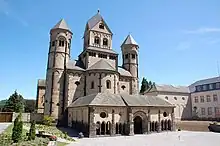 The famous Lake Laach (Ger. "Laacher See", literally "'Laachian' or 'Laky' Lake", i.e. "Lacustrine Lake" or "Lake of the Lake", comparable to the naming of "Loch Lochy" in Scotland) is the largest maar-like lake in the Eifel (more precisely a water-filled caldera) and has a 12th-century Benedictine monastery. The famous Abbey of Maria Laach is 12 miles (19 km) west of the town in the southern Fore-Eifel (Ger. Südliche Voreifel or Vordereifel, the south-eastern forelands of the Eifel).