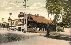 The original alignment of the Anderson Street station dates back to the chartering of the Hackensack and New York Railroad in 1856 by David P. Patterson and other investors. Their intent in creating the rail line was to help maintain a steam-powered train line in the Pascack Valley and have future ambitions to build the system northward. Construction on the new 21-mile (34 km) long line began in 1866, with trains heading from New York City to the Passaic Street station in Hackensack.[6] Although Hackensack was not a large hub, there were several rail lines serving the city, including the New Jersey Midland Line (now the New York, Susquehanna and Western Railroad) with stops at Main Street (at the Mercer Street intersection) and at Prospect Avenue.[7] During the 1860s, service was extended to north, terminating at Essex Street. Residents from the Anderson Street area donated $2,600 (1869 USD) to have a new station depot constructed along new tracks heading northward.[8] Although most Hackensack and New York trains ended at Passaic Street, service was extended northward on September 5, 1869, when that stop was abandoned in replacement for Anderson Street.[9] Just next year, service was extended northward on the Hackensack and New York Railroad Extension Railroad to Cherry Hill (now North Hackensack / New Bridge Landing) and onto Hillsdale.[10]