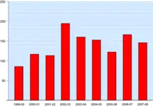Attendance levels at Andover's matches reached a peak in the late 1960s. During the 1969–70 season, home attendances at league matches averaged over 550, with the largest crowd being the 2,144 people who watched their FA Cup match against local rivals Salisbury.[40] In the years following their promotion to the Southern League, average attendances started to drop until they dipped below the 200 mark during the 1970s. Since then, the average attendance at Andover's matches has remained at approximately 140, although this figure dipped below 100 in the 1999–2000 season following their last relegation from the Southern League.[13] Just three seasons later however, this figure had risen to just under 200 following the club's second consecutive Wessex League championship and successes in cup competitions.[17]