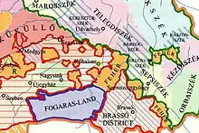In 2011, Méry Ratio published Erdély történetének atlasza (Historical Atlas of Transylvania), with text and 102 plates of maps by Bereznay.[12] A detail to the right illustrates Bereznay's use of color, texture and outline to show several features simultaneously on the same map from the atlas is shown to the right. In 2012, this atlas received a special award from the President of Hungary.[13][14] Bereznay undertook a lecture tour in Transylvania to discuss this work, and also presented it in Norway.[15][16][17]