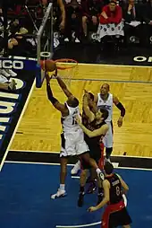Bargnani made his regular season debut against the New Jersey Nets on 1 November 2006, posting 2 points, 2 rebounds and 2 blocks in eight minutes of play.[7] In the process, he also became the fourth ever Italian-born player to play in the NBA.[8] Like many rookies, Bargnani took some time to adapt to the league and as he slowly improved his game, his confidence and playing time increased. In turn, the home fans soon warmed up to Bargnani; on 7 January 2007, 10,000 Bargnani figurines were given away at Air Canada Centre for the game against the Washington Wizards.[9] As the mid-season approached, Bargnani was selected as NBA's Eastern Conference Rookie of the Month (January 2007),[10] joining teammate Jorge Garbajosa (winner of the award in December 2006) as the sixth Raptors player to win the monthly honour.[10] Together with Garbajosa, Bargnani was also selected to play in the T-Mobile Rookie Challenge game.[11] After the All-Star break, Bargnani continued to work on his defence and shooting (averaging 14.3 points per game (ppg) and 3.9 rebounds per game (rpg) in 12 games in February 2007), and he was selected as the Eastern Conference Rookie of the Month for the second straight time on 1 March 2007.[12] Bargnani became the third Raptor ever to win the award twice, joining Vince Carter and Damon Stoudamire.[12]